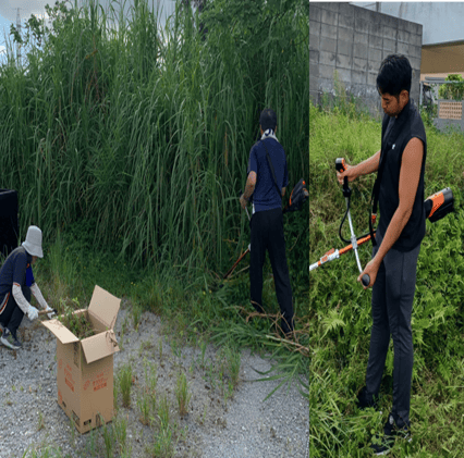 横田自治会駐車場の草刈りを行いました。当日参加できない職員は事前に草刈り作業を行っています。